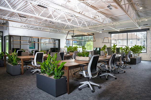 The 1900’s-era building had sat vacant for years before the renovation. The existing building structure was large enough to create two separate office suites, each just over 3000 sf, with 4,500sf allotted for shared amenities including a kitchen/café, gym, lobby, conference rooms, and a bar.
